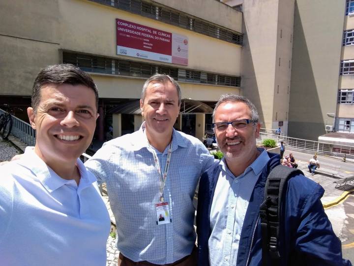 Legenda da Imagem: Prof. André Bellin Mariano (Departamento de Engenharia Elétrica - UFPR), Prof. Railson Henneberg (Gerente da Divisão de Apoio Diagnóstico e Terapêutico - Hospital das Clínicas - UFPR), Prof. Wesley Maurício de Souza (Departamento de Análises Clínicas - UFPR).