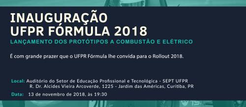 No dia 13 de Novembro, às 19:30, a equipe UFPR Fórmula fará um Rollout para apresentar seus novos protótipos a combustão e elétrico, no Auditório do SEPT UFPR. Mais informações podem ser vistas na imagem abaixo.